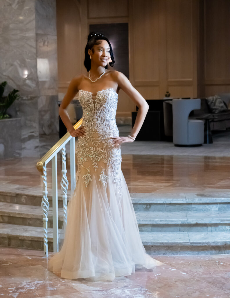 The result? Those illuminated stairs created the exact dreamy glow Brooke envisioned. The architectural lines matched her dress perfectly, and the built-in lighting eliminated the need for complex lighting setups.